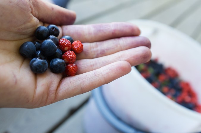 Löytyipä mustikoiden lisäksi tänään vakkaripaikasta metsämansikoitakin, ja vielä niin paljon, että melkeen päätä huimasi, korvissa soi ja nenäontelot valloitti aivan huumaava tuoksu. Kyllä on Helmin kelvannu vedellä aamupuuroja nassuun kunnon särpimillä, ja mummun tekemään suklaa-mantelikakkuun saatiin kunnon täyte!