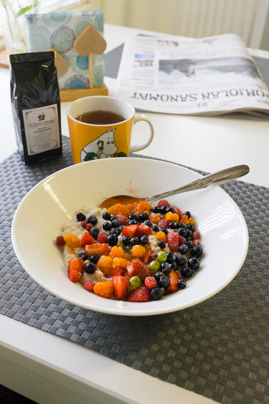 Tästä en voi ottaa kunniaa, kun oli mummun&papan poimimia. Eipä ole joka aamupalalla tämmösiä puuron kyytimiehiä; hilloja, mustikoita, mansikoita ja viherherukoita. Ja kun ei kahvi nyt maistu, niin herkuttelinpa Oulun Kofeiinikomppanian mulperi-meloniteellä.