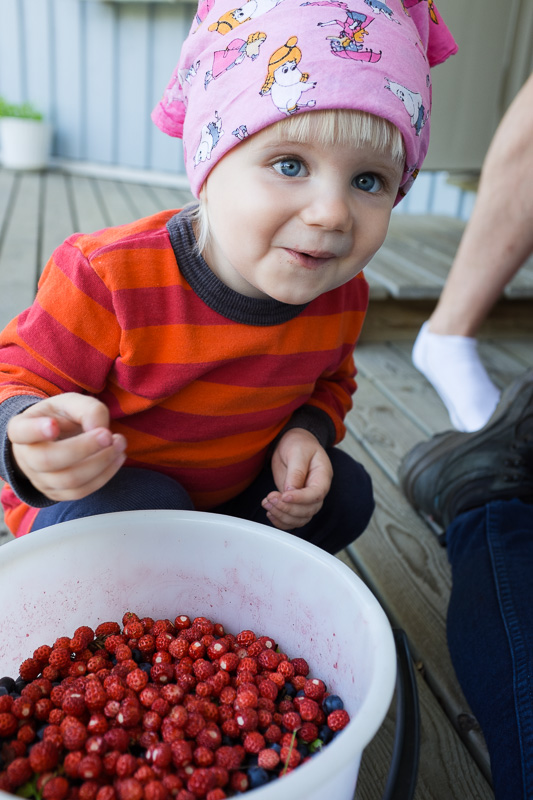 Löytyipä mustikoiden lisäksi tänään vakkaripaikasta metsämansikoitakin, ja vielä niin paljon, että melkeen päätä huimasi, korvissa soi ja nenäontelot valloitti aivan huumaava tuoksu. Kyllä on Helmin kelvannu vedellä aamupuuroja nassuun kunnon särpimillä, ja mummun tekemään suklaa-mantelikakkuun saatiin kunnon täyte!