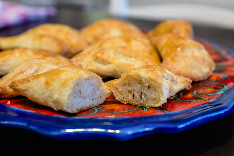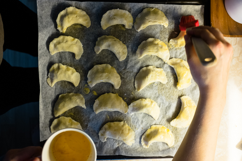 Taikinan kauliminen käy helpoiten, kun ottaa taikinan kylmästä (kovettunut pari tuntia-yön yli) ja jauhojen avulla pyörittelee hetken käsissä, sitten kevyesti jauhotetulla pöydällä kaulitsee pala kerrallaan levyksi ja painelee isolla lasilla tai pyöreällä muotilla palasia. Täytenökäre keskelle ja varovasti taitellen tasku kiinni. Voitele munalla ja paista 200 asteessa n. 10 minuuttia, kunnes on kullankeltainen.