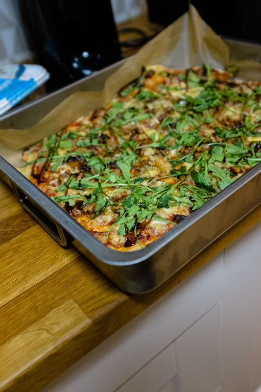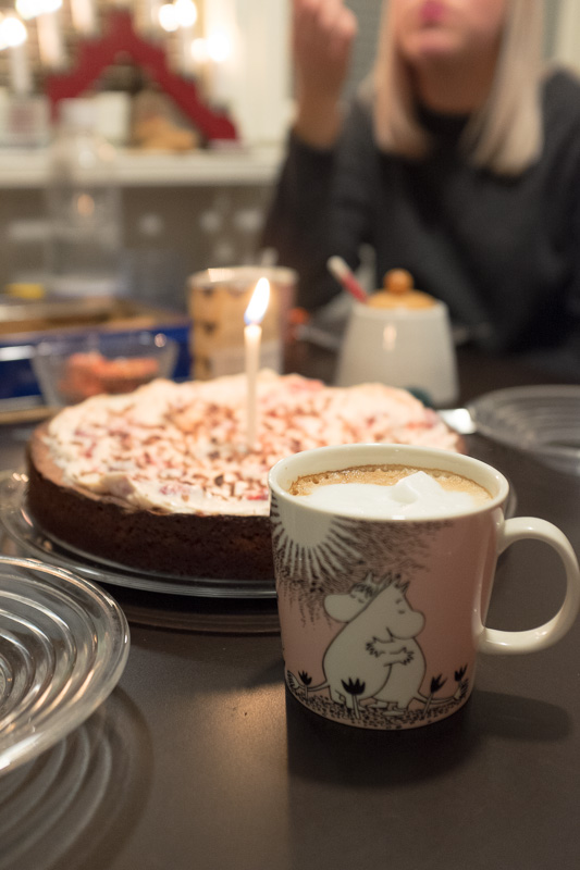 Jälkkäriksi/synttärikahvittelukakuksi Radek sai tutulla ohjeella tehtyä mutakakkua – nyt pakastemansikat ja suklaarouhe mausteena 🙂