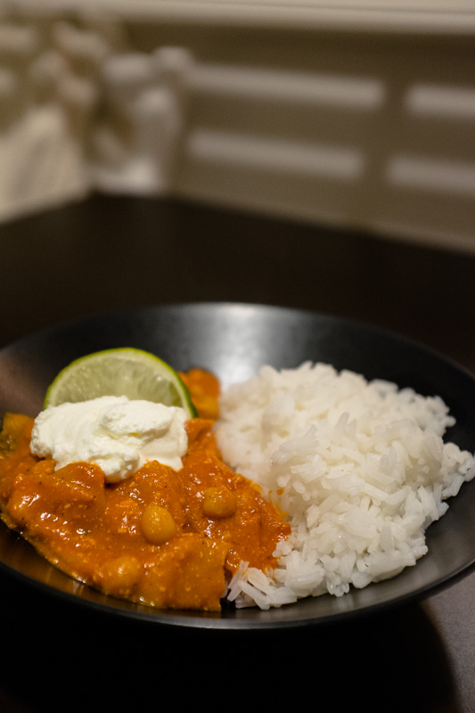 Sekoita marinadin ainekset ja anna maustua yön yli, tai vähintään pari tuntia. Ota huoneenlämpöön puolisen tuntia ennen kypsennystä. Paista uunissa 250-275 asteessa 10-15 minuuuttia, ja laita sillä aikaa kastikkeen ainekset kattilaan kiehumaan hiljalleen. Lisää sitten mahdollisesi jopa vähän hiiltyneet kananpalat marinadeineen kattilaan ja keittele vielä 20-30 minuuttia. Keitä sillä aikaa riisi kypsäksi. Tarjoile limen ja jogurtin kanssa höyryävän kuumana.