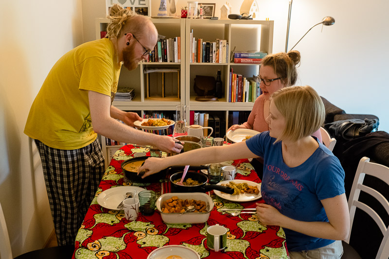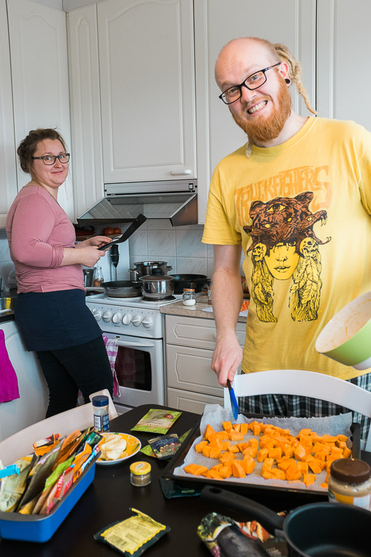 Veli tuli tyttökaverinsa kans kylään ja päätettiin yhteistuumin kokkailla vähän jotain uutta ja erilaista – tällä kertaa afrikkalaisia makuja. Inspiraatio siihen oikeastaan löytyi Me naiset -lehdestä ja liverpoolilaiskokemuksesta vuosien takaa ;). Omasta reseptikirjasta löytyi lisäksi palava chicken -ohje. Melkeen meni överiksi sorttimenttien kanssa, mutta aij että tuli hyvää! Värminkejä haettiin Turun kauppatorilta ja -hallista (ja ruokahalua ja nälkää Kuralan kylämäestä).