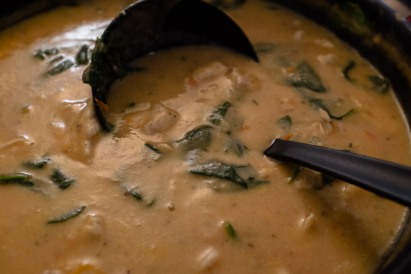 Leikkaa kana suikaleiksi ja sekoita kulhossa suolan, pippurin ja valkosipulin kanssa. Anna maustua hetki ja paista sitten kahdessa erässä pannulla, ja laita sivuun odottamaan. Kuumenna öljyä pannulla ja lisää tomaatit ja sipulit. Paista niitä noin 5 minuuttia. Alenna lämpöä ja lisää maapähkinävoi ja kanaliemi. Keitä viitisen minuuttia sekoitellen jolloin maapähkinävoi suurustaa kastiketta. Voit lisätä kanalientä, jos haluat enemmän nestettä. Lisää chili, pinaatti ja kanasuikaleet ja tarkista maku. Anna porista vielä miedolla lämmöllä 10-15 minuuttia.
