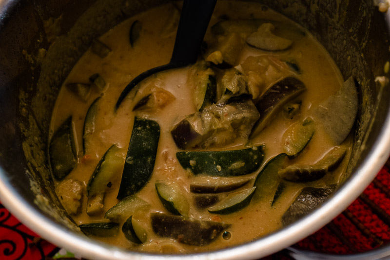 Paloittele kesäkurpitsa ja munakoiso kiekoiksi ja edelleen neljään osaan. Itketä niitä halutessasi hetki. Pilko tomaatti ja silppua sipuli. Kuumenna öljy pannulla tai kattilassa ja lisää curry sekä kesäkurpitsat, munakoisot ja sipulit. Paista kunnes ne saavat väriä. Lisää sitten tomaatti ja paistele vielä viitisen minuuttia. Lisää maapähkinövoi ja vesi, sekoita ja mausta suolalla. Anna kiehua kunnes kasvikset ovat kypsiä.