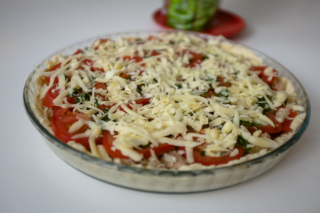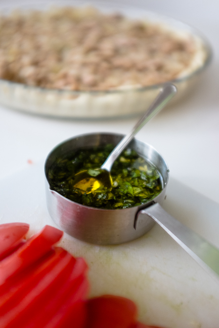 Levitä piirakan päälle pohjalle sinappi, sitten tonnikala, tomaatit, yrtti-öljyseos, ja lopuksi juustoraaste. Paista 200 asteessa n. 25 minuuttia tai kunnes taikinan reunat ovat ruskettuneet, juusto sulanut ja rapeutunut, ja keittiön vallannut ihana valkosipulin tuoksu!