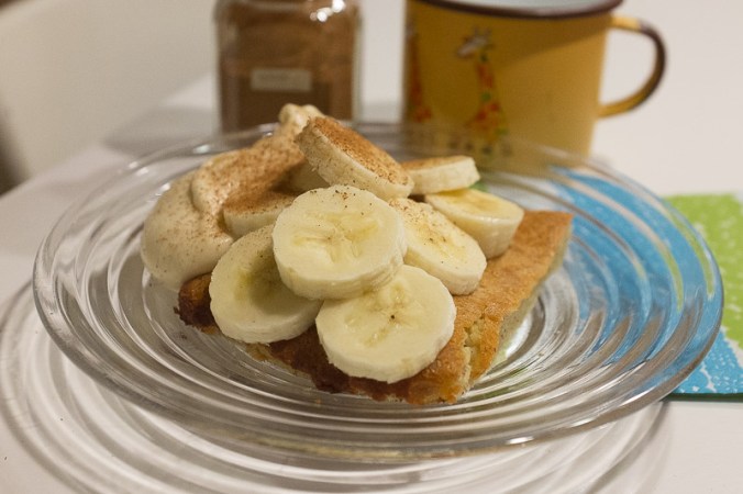 Bongasin tämän reseptin Kotivinkistä, ja kun meillä sattui lojumaan pöydällä yksi jo elämää nähnyt banaani, ja kaapissa eilen vanhaksi mennyt kaura-vaniljakastikepurkki (ups, vielä ehtii), päätin kokeilla pannaria iltapalaksi.