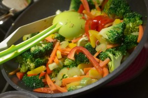 DSCF6591Kasvissosekeittoon laitoimme oikeastaan vähän kaikkea, mitä kaapeista (ja torilta)