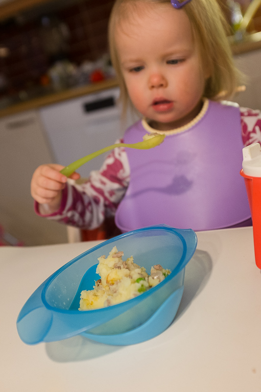 Ostaessani jauhelihaa ostan yleensä 700-1000 g kerrallaan, paistan ja pakastan osan. Siitä saa sitten nopeesti esim. liha-makarooniseoksen (keitä pasta kypsäksi ja lisää jäinen jauhelihamuru, sekoita, lapa lautaselle ja raasta juustoa päälle!) tai esim. tällaisen perunamuusikerroslaatikon. Aika usein perunamuusiakin tulee tehtyä usean päivän tarpeisiin.
