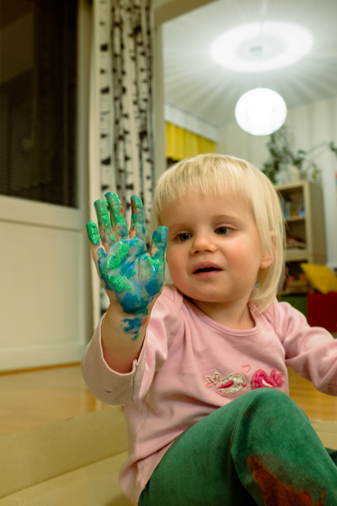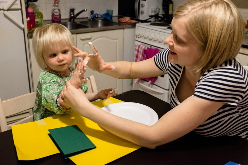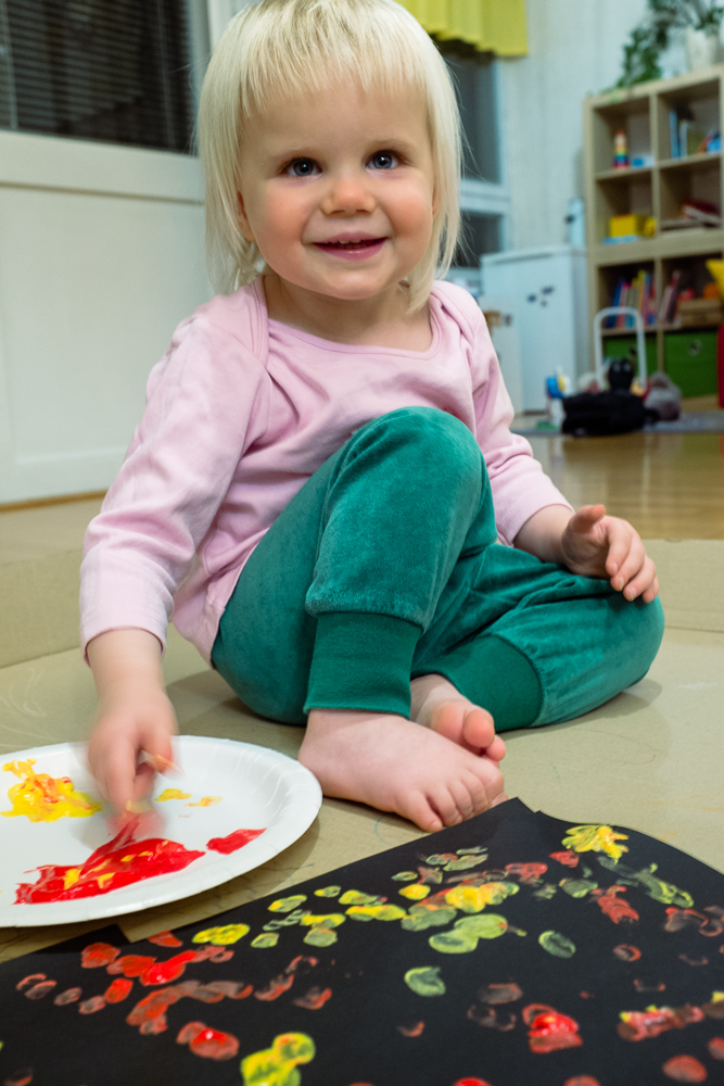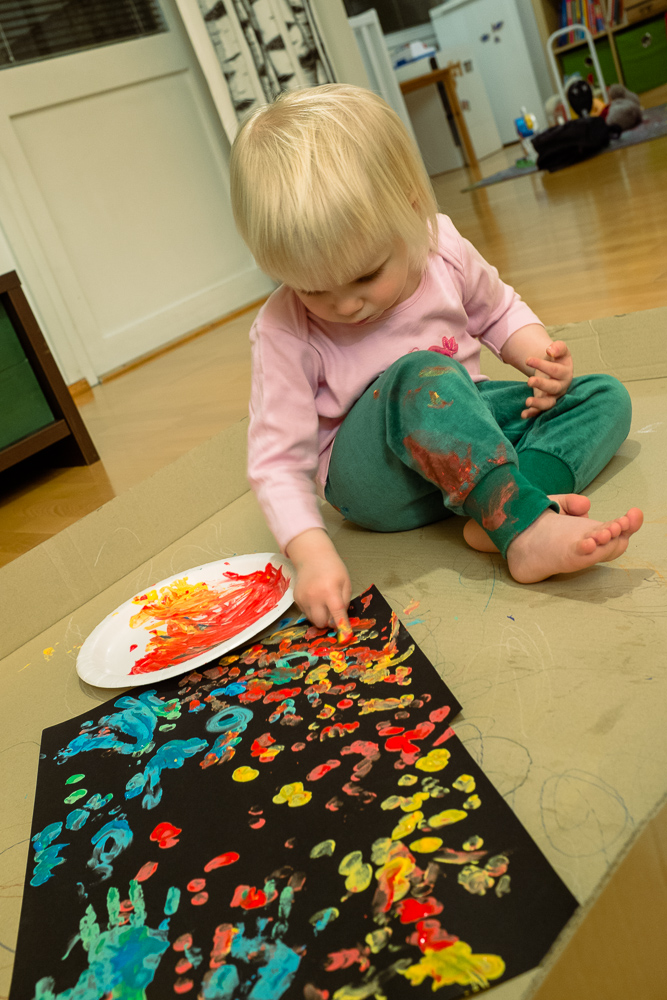 Eksyin elämäni ensimmäistä kertaa Turun keskustan askartelupuoti Presentoon, jota ei turhaa mainosteta askartelijan karkkikaupaksi. Sinne vaan EI kannata mennä toppahaalarisen taaperon kanssa, joka ylettää vaunuistakin nopeasti hipelöimään kaikenlaista kivaa ja värikästä. No meillä oli onneksi selvät sävelet: halusimme ostaa sormivärejä ja puukirjaimia. Ja niitähän löytyi. (Ja äiti lähtee sitten uudestaan kauppasille ihan yksin!) Illalla levitettiin olkkarin lattialle iso pahvialusta suojaksi ja tytön ilme on aika huikea kun loruutin kertakäyttölautasille värejä, ja näytin että nyt SAA vapaasti sörkkiä ja lähmiä ja töhriä ja levitellä maalia kartongille. Wuhuu! Maalit näyttikin laimentamattomina varsin herkullisilta – varsinkin mustalla paperilla.