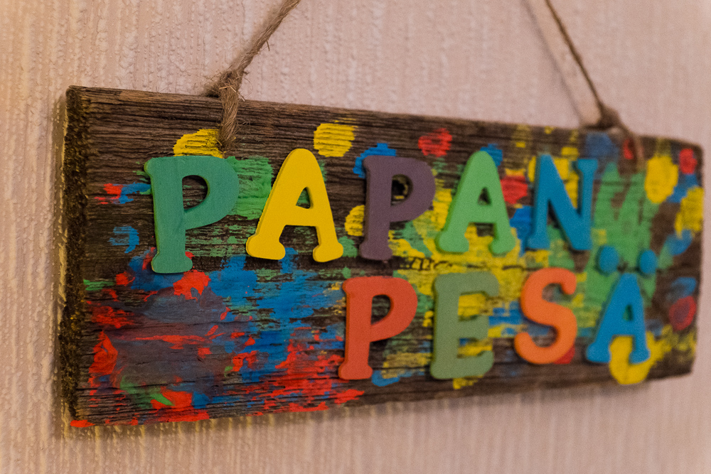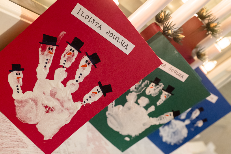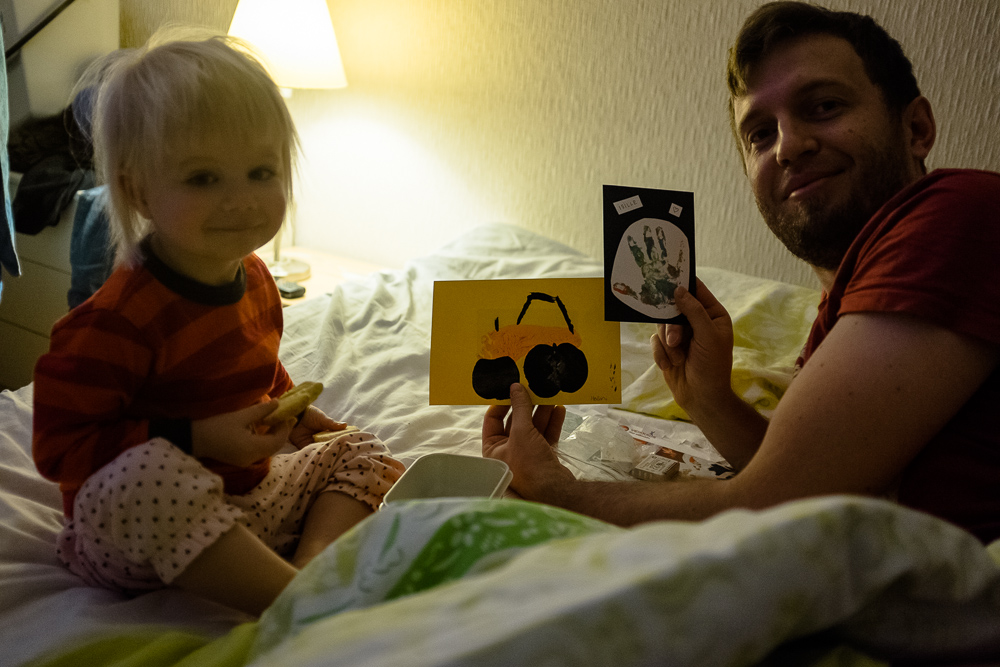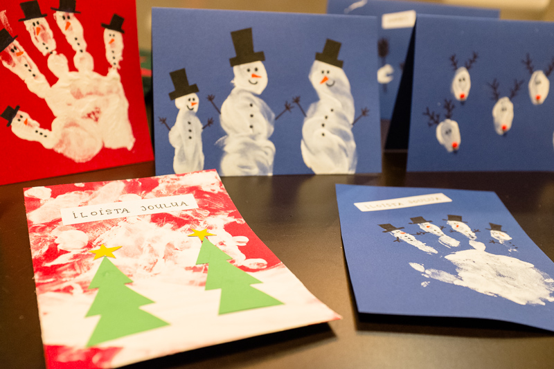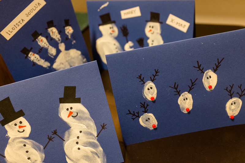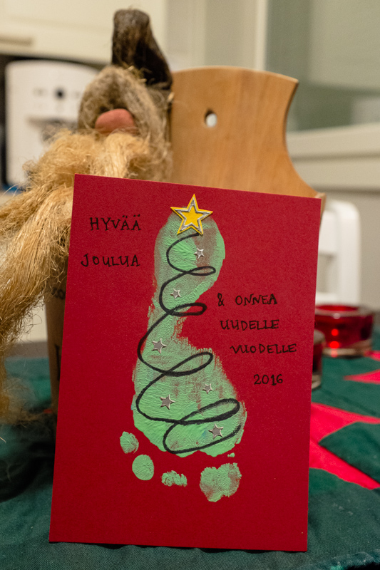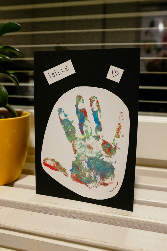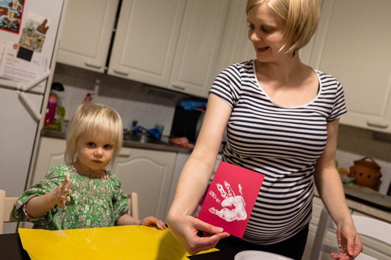 Otettiin sitten vielä toinenkin iltaistunto ja maalattiin papalle isänpäivälahja ja parit kortit siinä sivussa. Nyt saa pappa luvan kanssa merkata reviirinsä eli oman ”telkkarinkatseluhuoneensa” :). Tosin vasta myöhemmin sain kuulla, että kuivuessaan sormivärit ei tahdo pysyä muussa kuin paperissa, eli jännityksellä odotamme miten papan pesän maalit rapistuu… Puu oli kuitekin ihanasti patinoitunutta (kiitos löydöksestä työkaverille), eikä mitään lakkapintaa, eli toivossa on hyvä elää!