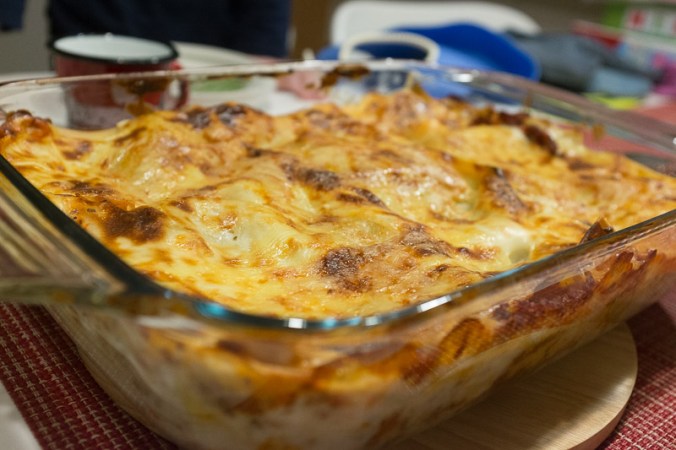 Juustokasteikkeeseen: vatkaa paksupohjaisessa kattilassa kylmään maitoon jauhot ja kuumenna sekoitellen kiehuvaksi. Anna hetken poreilla, kunnes kastike sakenee ja lisää sitten juustoraaste ja mausteet, koko ajan sekoittaen. Tähän ei mene kauaa 🙂 Nosta liedeltä ja kasaa lasagne: pohjalle juustokastiketta, sitten tomaattikastiketta, sitten lasagnelevyjä, ja sama uudelleen niin kauan että matskut on vuoassa ja päällimmäisenä on pikkusen juustokastiketta (ettei ylimmät lasagnelevyt kuivahda). Raasta päälle vielä pikkusen juustoa ja laita uuniin 200 asteeseen noin 35 minuutiksi. Me lähdettiin muksujen kans ulos nauttimaan lumesta, joten laitoin uunin 175 asteeseen ja pidin varmaan melkeen tunnin. Olipa ihana tulla punaposkisena ja nälkäisenä sisälle SYÖMÄÄÄÄÄÄN!