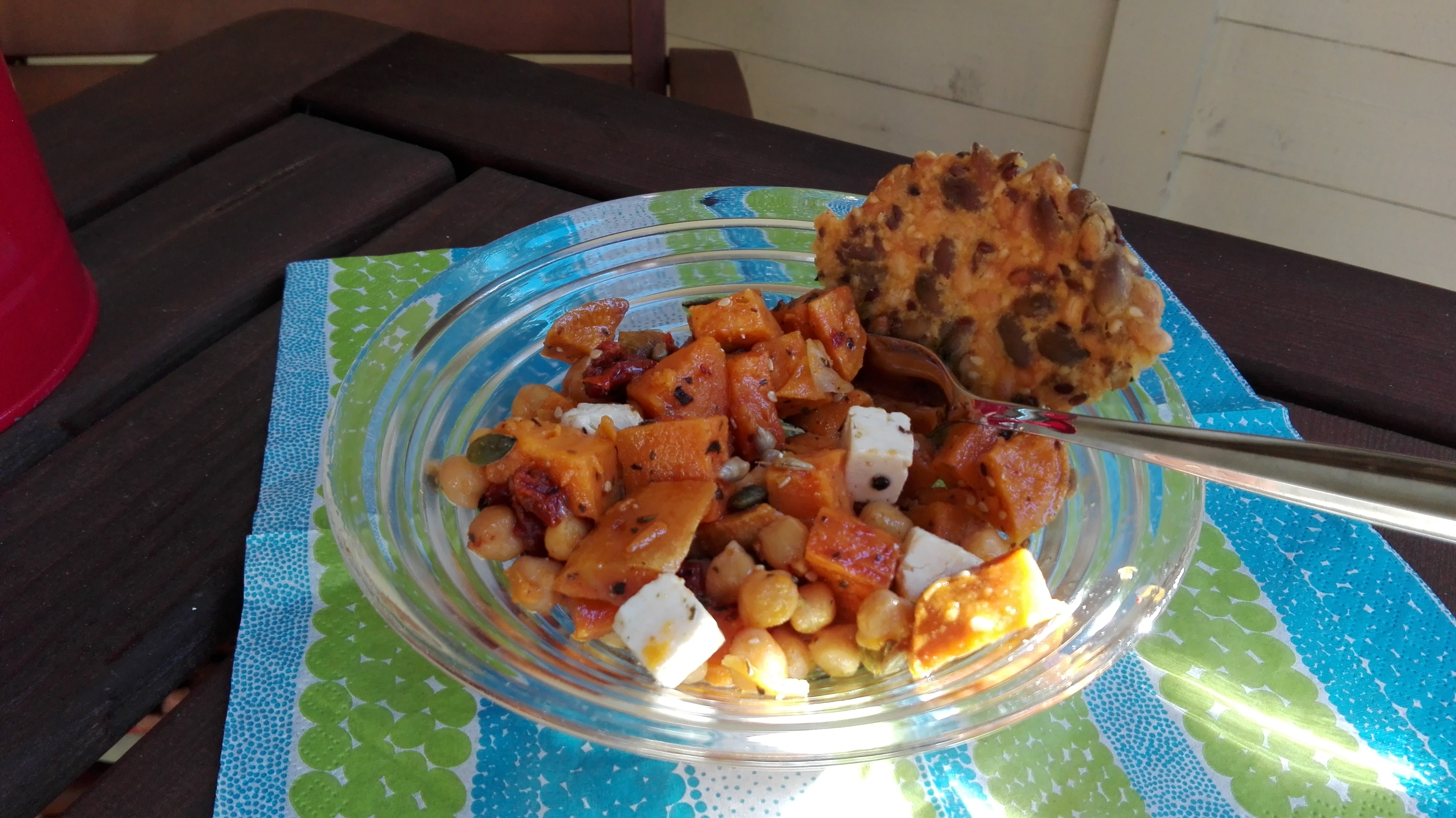 Kuutioi bataatti, levitä uunipellille, mausta suolalla ja hulauttele päälle öljyä. Paahda 225 asteessa n. 25 minuuttia, tai kunnes kuutiot ovat pehmeitä, eikä vielä ihan muusia. Anna jäähtyä. Sekoita varovasti kaikki muut aineet bataatteihin (tarjoa kuutioitu feta erikseen jos ruokakunnassa on maitoallergisia tai vegaaneja). Mausta pippurilla ja yrteillä. Anna maustua ainakin hetki jääkaapissa ennen tarjoilua.